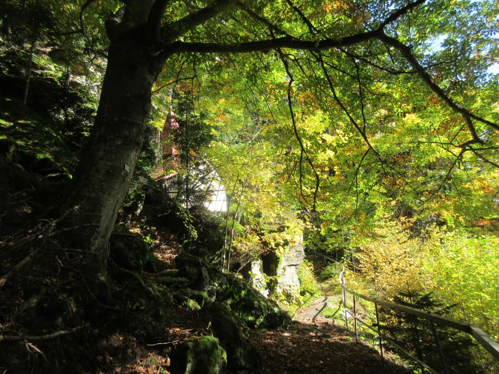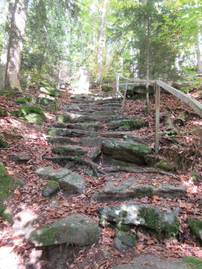 Fast schon sind wir ganz oben! Den steilen Anstieg über die uralten Treppen aus Granitsteinen haben wir geschafft. Seht ihr die Wolfgangskapelle wie einen Juwel durch die Blätter schimmern?