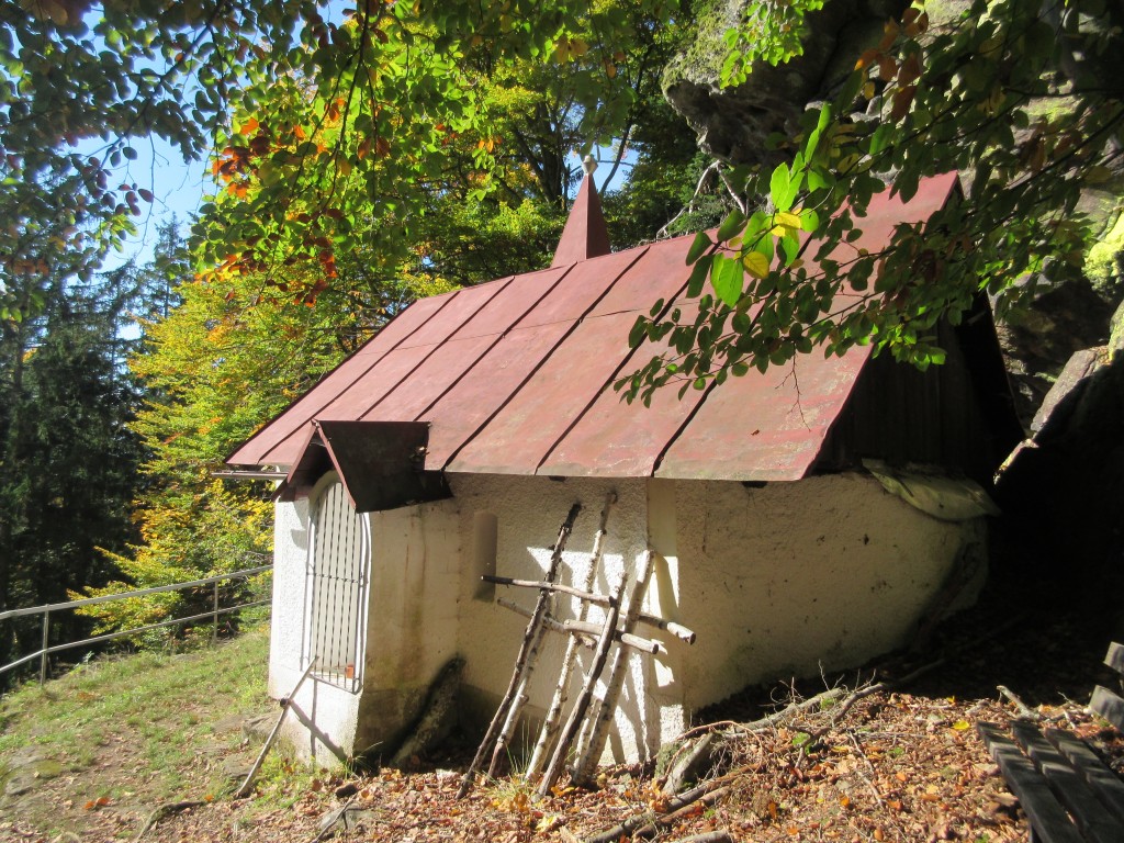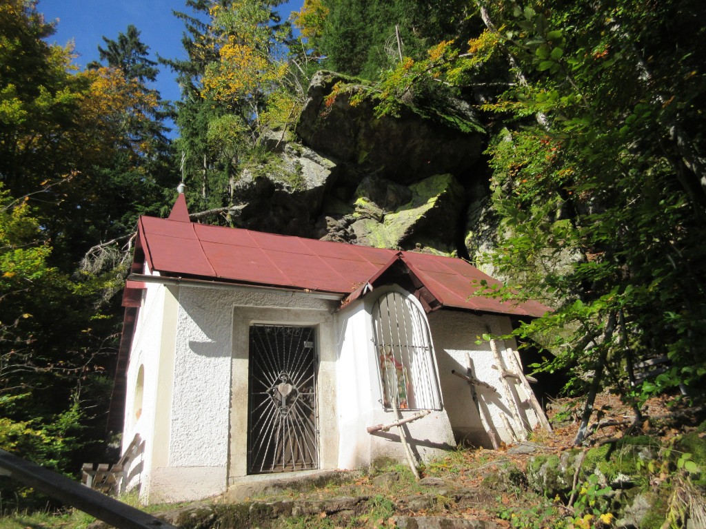 Unter Felsen eingebettet liegt das Juwel. Der Teufel musste der Sage nach damals helfen, die Kapelle zu bauen.