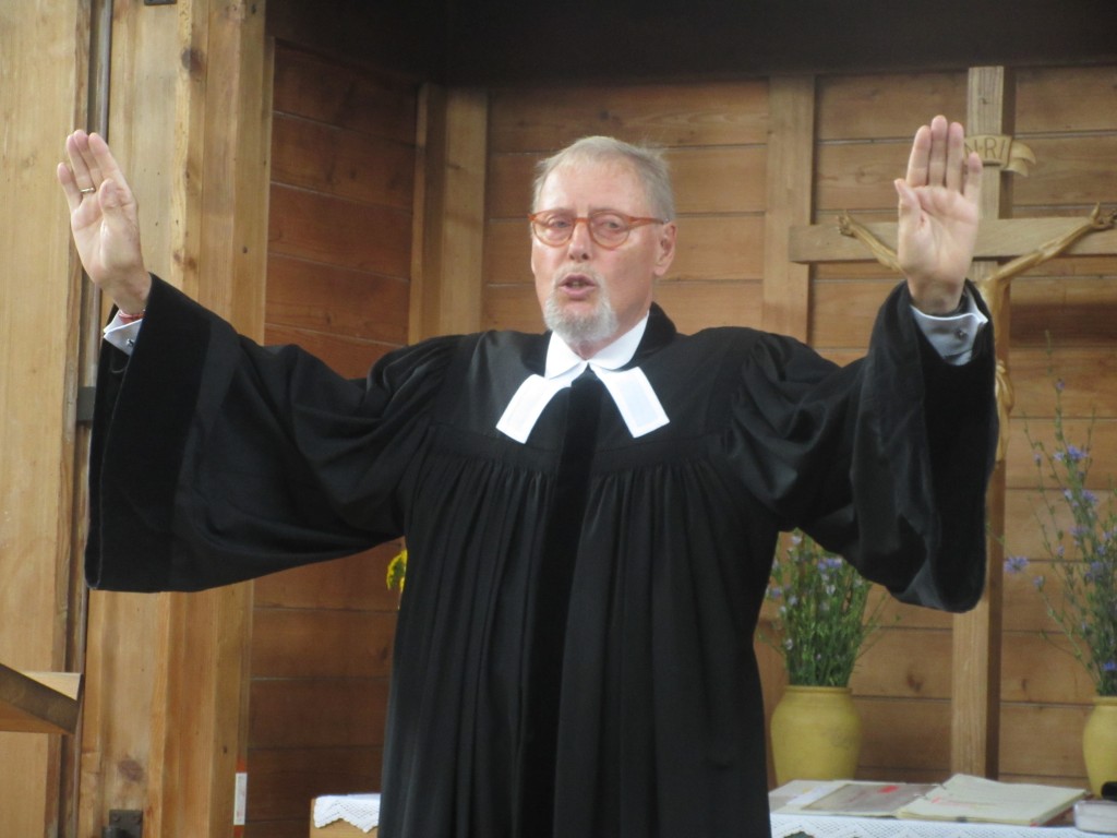 Professor Dr. Peter fröhlich begrüßt die Gemeinde und Pfarrer Dr.Traugott Farnbacher, der als Gastprediger und treuer Freund der evangelischen Kirchengemeinde mit seiner Frau einige Tage im Bayerwald verbringt.