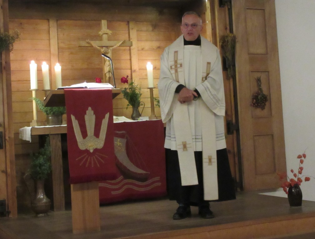 „Wir sind alle eins in Christus!“ sagte Pfarrer Roland Kelber, „Christus ist der Namensgeber unseres Kirchenbaus. Heute ist ein schöner Anlass, zur 75 Jahrfeier unsere Zusammengehörigkeit hier zu erleben. Denn wir kämpfen nicht mehr gegeneinander, sondern stehen gemeinsam im Glaubenskampf.“