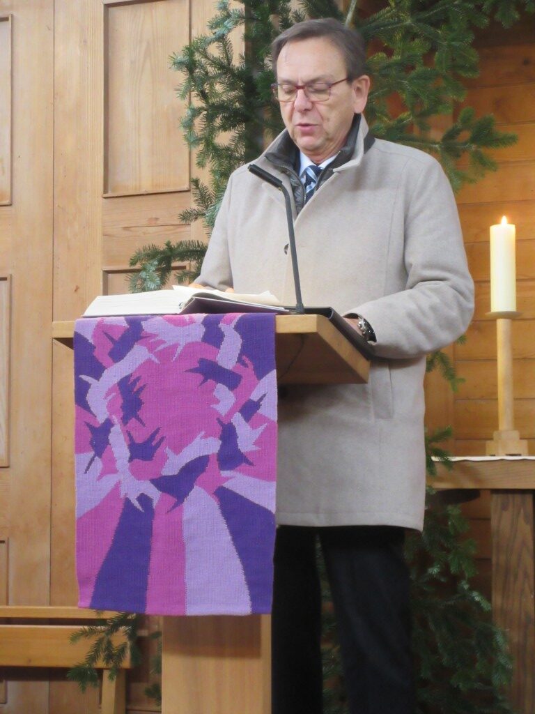 Prof. Dr. Peter Fröhlich las nun ein Grußwort von Altpfarrer Ernst-Martin Kittelmann vor, der leider wegen einer wichtigen anderen familiären Feier nicht persönlich anwesed sein konnte. Pfarrer Kittelmann wurde 1977 beauftragt, die Leitung der Christuskirche zu übernehmen. 40 Jahre lang war er hier Pfarrer.