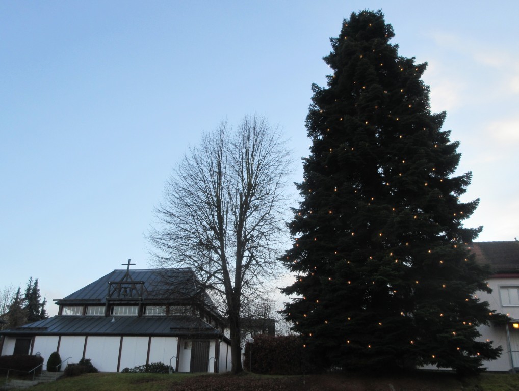 Am Vorplatz der Chistuskirche steht die große, mit vielen Lichtern geschmückte Nordmanntanne