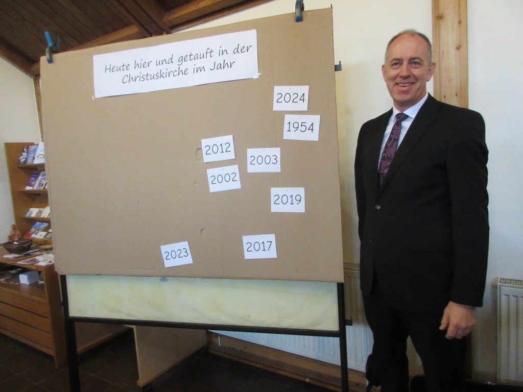 Prof. Dr. Peter Fröhlich brachte sich nun ein zum angekündigtem Thema der Taufjahrgänge, die in der Christuskirche Viechtach seit ihrer Gründung getauft worden sind. Die älteste Getaufte, die heute anwesend war, war Dorothea Stuffer. Sie wurde. Im Jahr 1954 hier getauft. Der jüngste anwesende Täufling wurde genau 70 Jahre später 2024 in dieser Kirche getauft. Nun wurden unter den anwesenden Täuflingen, mit deren Namen kleine Zettel angefertigt worden waren, das Los gezogen. Erwählt durch das Los wurden 3 Täuflinge, nämlich Dennis, ein Konfirmand, Erich, ebenfalls ein Konfirmand, und der Jüngste Gottesdienstteilnehmer im Alter von 2 Jahren. Bürgermeister Franz Wittmann garantierte den drei Gewinnern eine Jahreskarte für das Freibad.