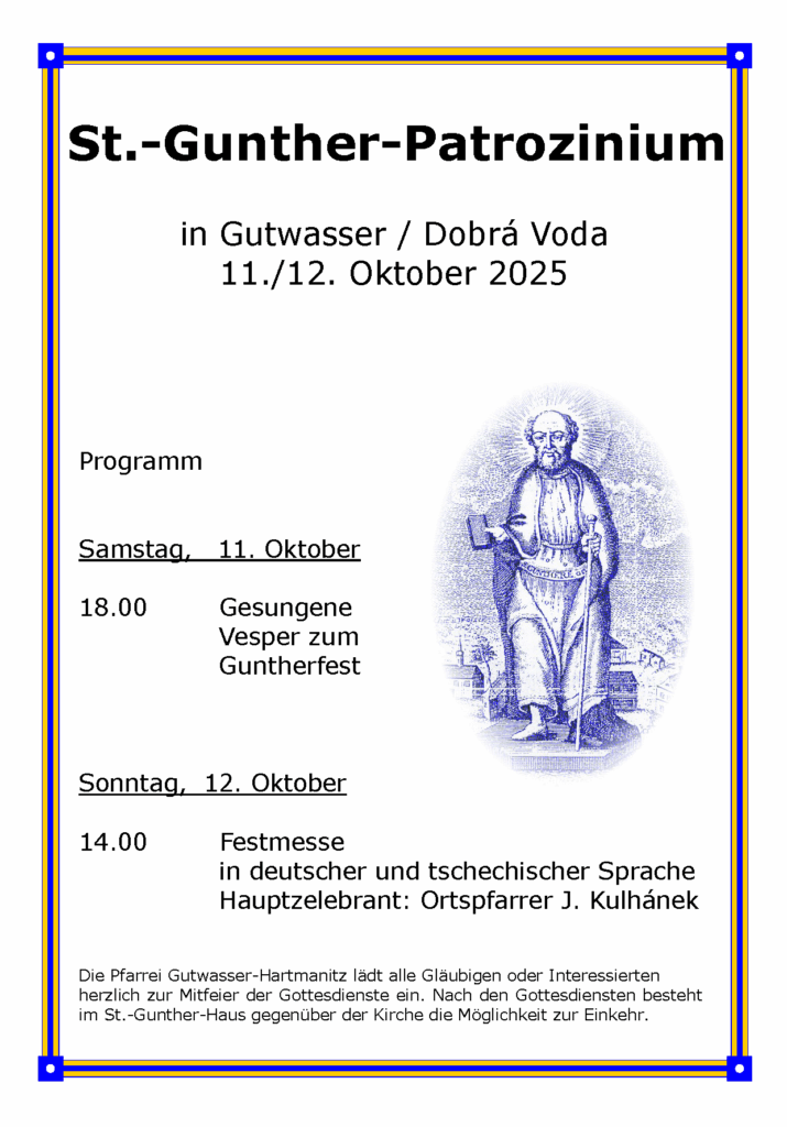 ich möchte Sie über die diesjährige Feier des St.-Gunther-Festes in Gutwasser (Dobrá Voda) bei Hartmanitz am 11./12. Oktober informieren.