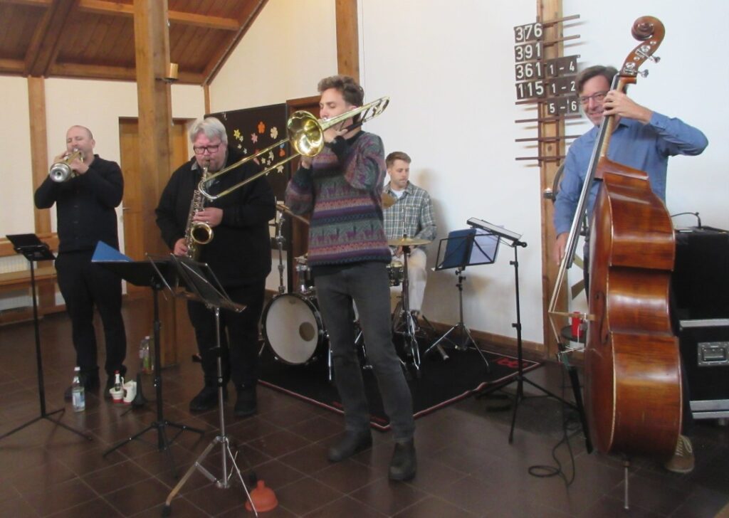 Etwa 20 Personen trafen sich mit ihren Instrumenten nun im alten und neuen Gemeindesaal und im Kirchenraum der Christuskirche. Dieser Kirchenraum ist in seiner universellen und offenen Architektur sehr gut geeignet für interessante Projekte. Groovige Jazzmusik in einem experimentellen Workshop: Einfach mal probieren!